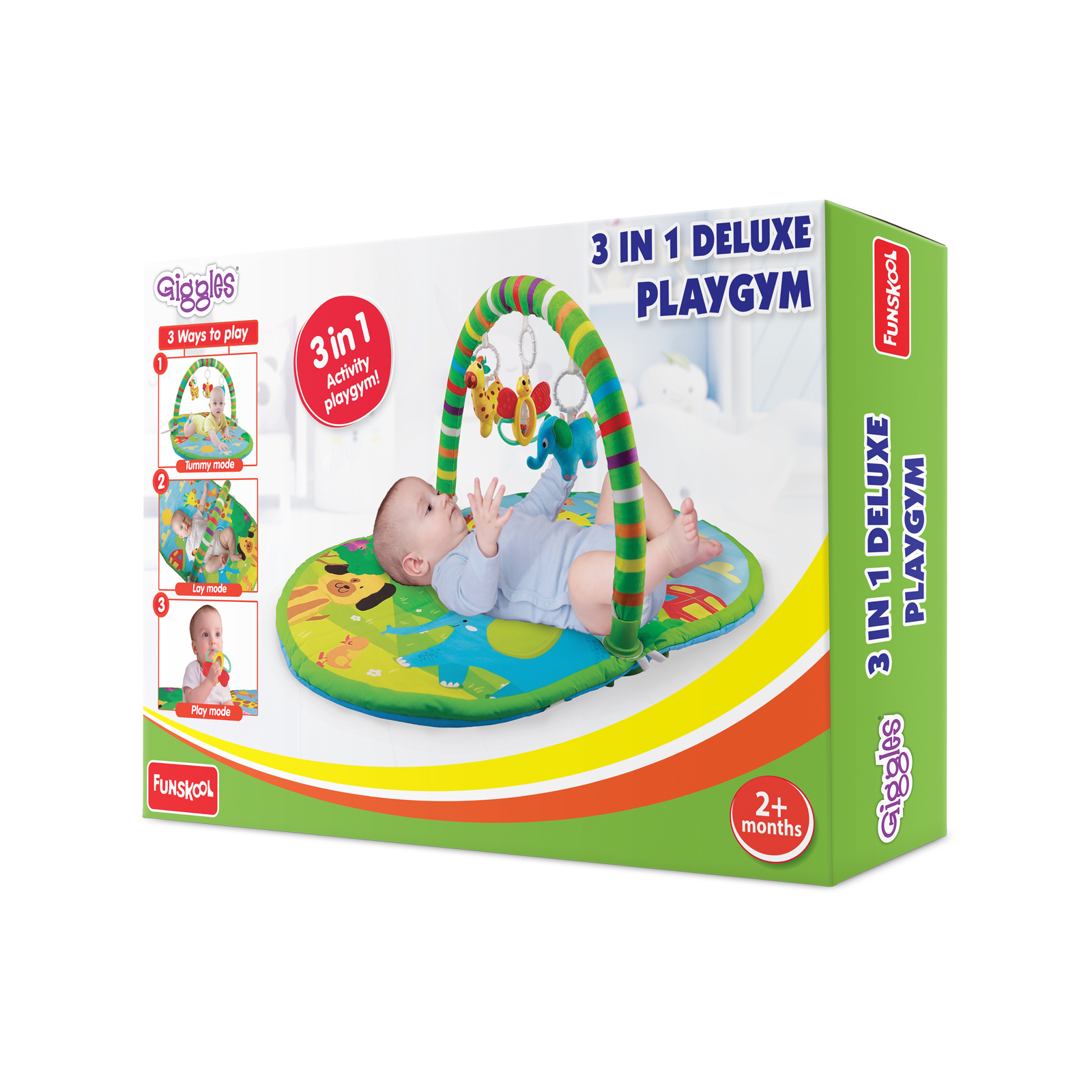 This Deluxe Playgym comes with 3 modes-lay&play, tummy-time and sit&play. To keep the baby busy and curious, 3 toys come into action-Elephant squeaker, Butterfly teether-rattle and Giraffe rattle. When the play is done, the Playgym can be folded for easy portability and storage