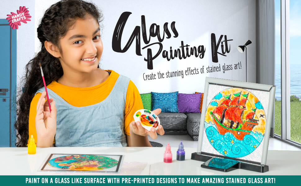 Help your child develop creative art skills with this glass frame painting set. The set enables kids to imagine and explore. It lets them create stunning effects from stained glass art.