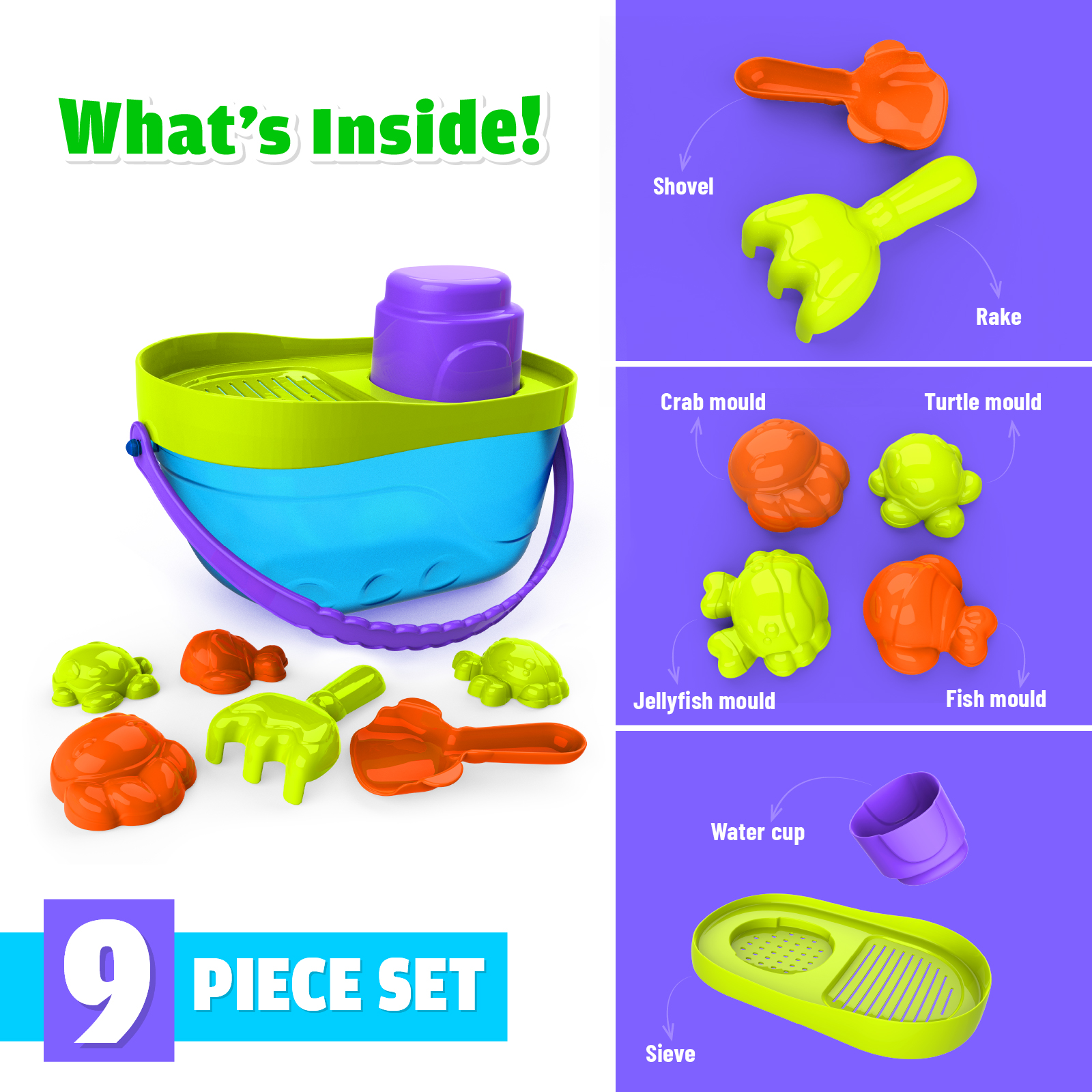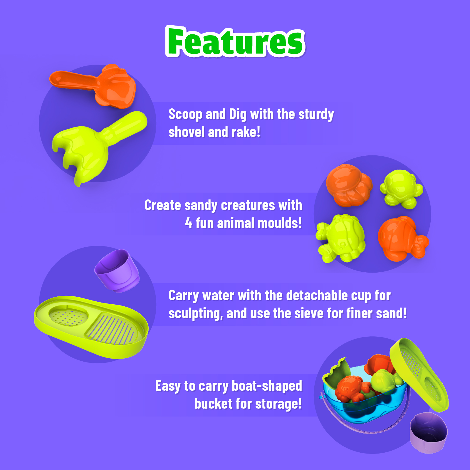 This fun-filled sand playset is packed with tools, moulds and accessories for endless creative fun. Whether at the beach, park or at home, kids will enjoy scooping, shaping and crafting sandy creatures again and again.