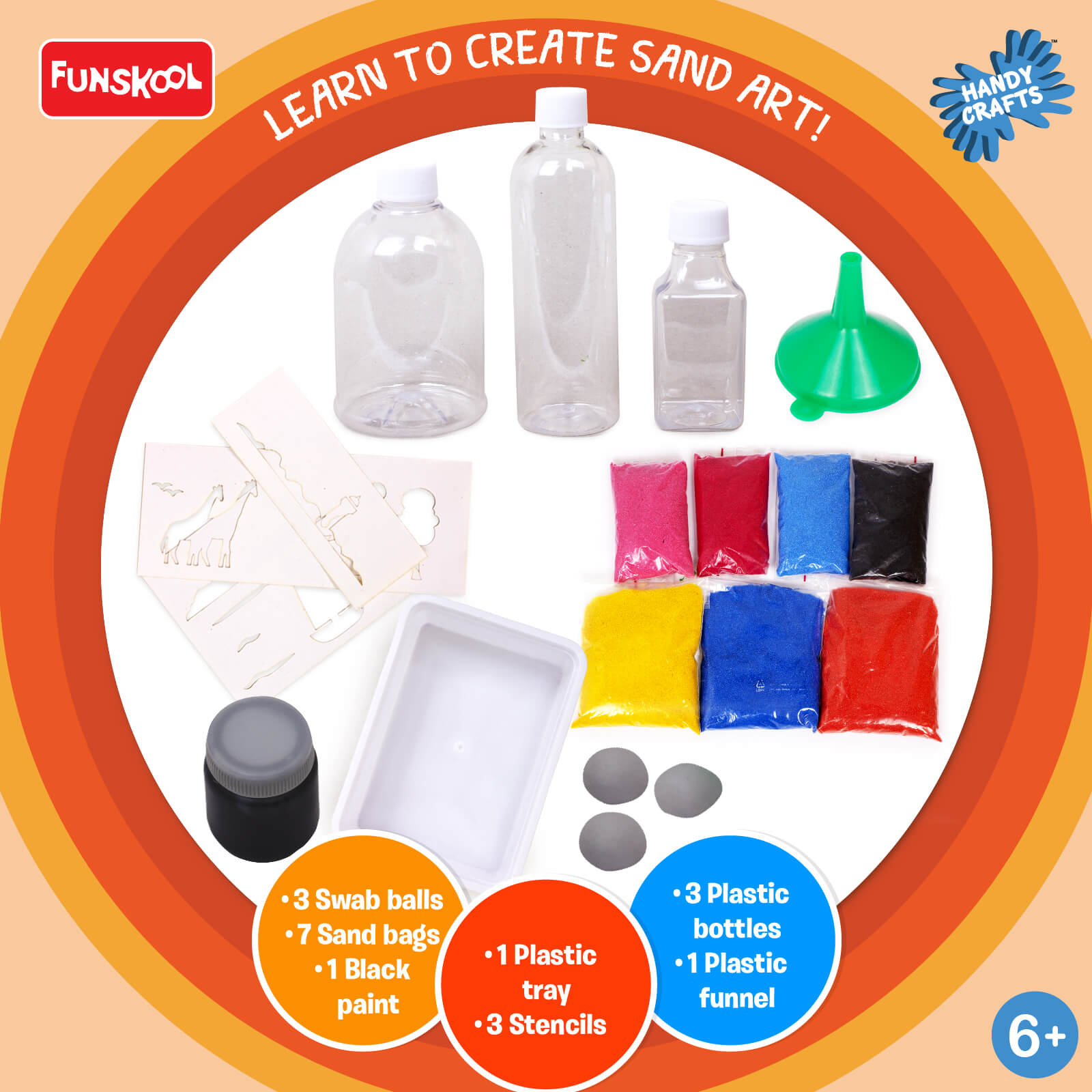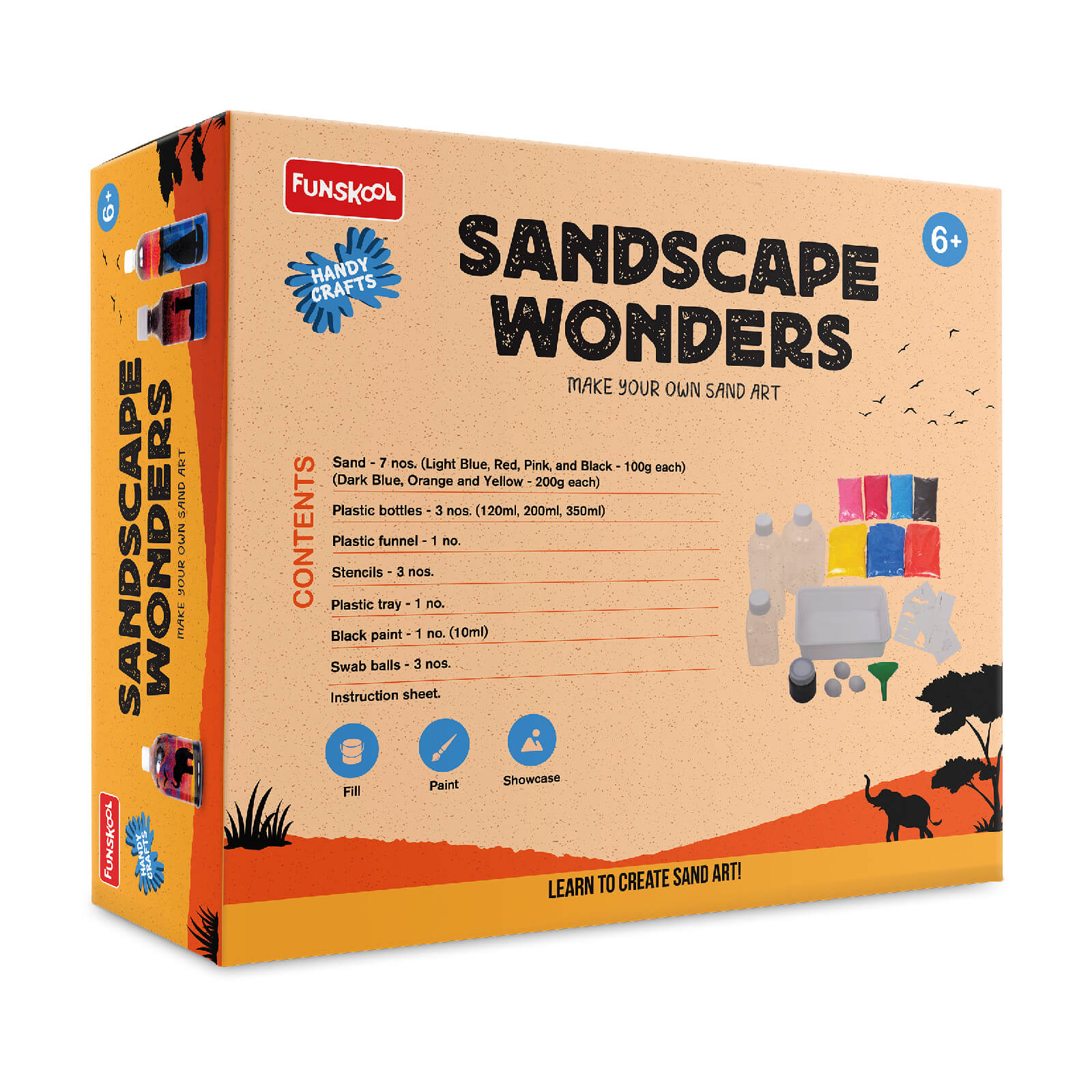 Funskool DIY Sandscape Wonders Art and Craft Kit is the perfect companion for anyone looking to unleash their creativity while enjoying the soothing feel of sand beneath their fingertips. Whether you’re a seasoned artist or a beginner, this kit is designed to provide hours of relaxation and artistic expression.Explore your artistic abilities with an assortment of sculpting tools specially crafted for working with sand. Carve intricate patterns, mold unique shapes, and experiment with textures to create stunning landscapes or intricate designs.