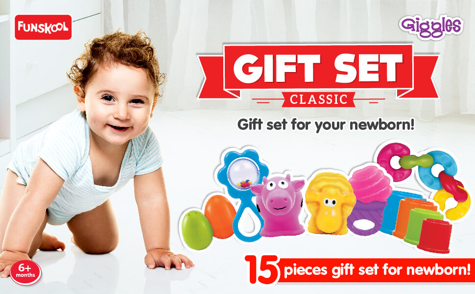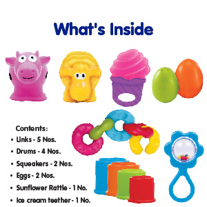 Gift Set Classic engages the attention of the baby and ensures early development with a set of 15 toys ranging from rattles to teethers, squeakers to linking toys, and more. Designed in eye-catching, vivid colours and in different shapes and sizes, the toys develop the baby’s observation and motor skills. Includes: Teether, Rattle, squeakers, drums, chain links, Nesting eggs