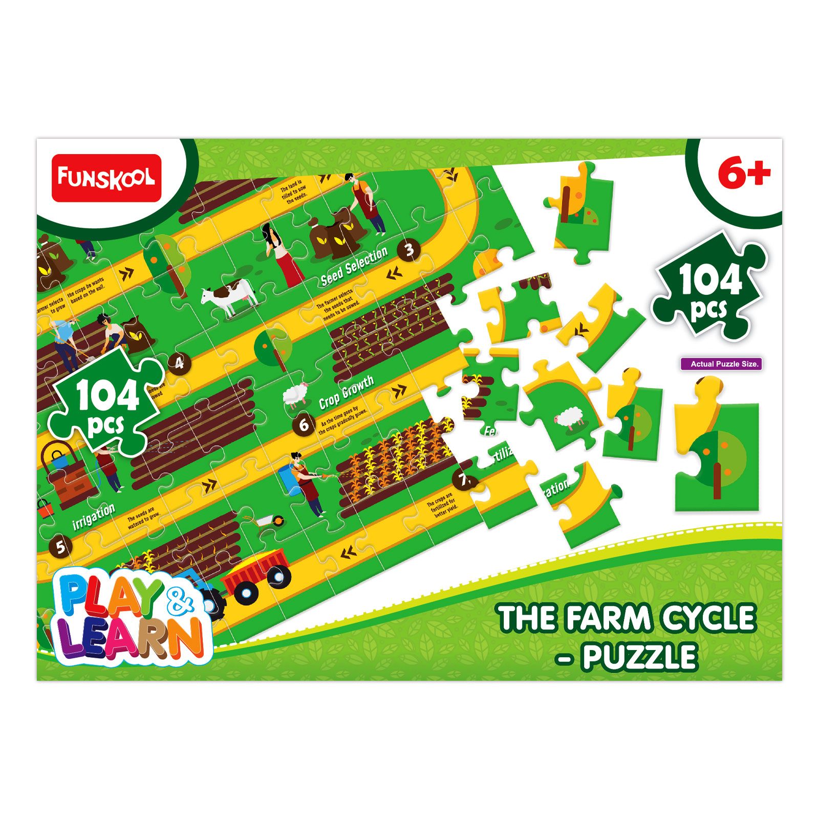 Away from the bustling city life, lies the backbone of our country, the Farmlands! Teach children something they very rarely witness in the city, the Farming process! This 104 pieces puzzle graphically depicts the various stages of Farming!
