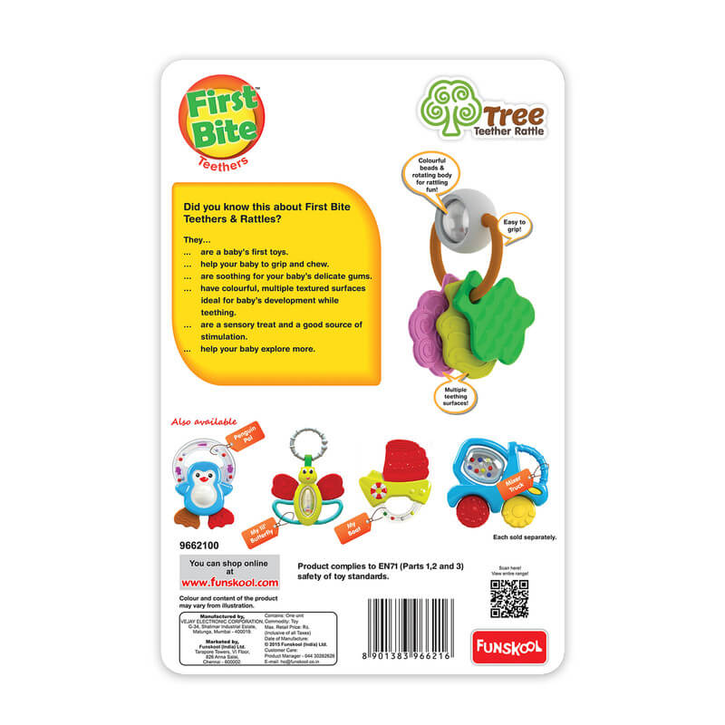 The Funskool tree teether rattle has been designed to keep children engaged by introducing them to a range of textures, sounds, and shapes. Your child can have a wonderful time while observing the bright colours while handling this rattle. Motor skills and hand-eye coordination are an important part of a child’s development. This rattle not just focuses on these skills, but also develops your child’s sense of feel and touch. With this toy, precise movements can create specific sounds from the teether rattle and this can be used to teach children the basics of cause and effect.